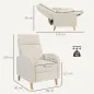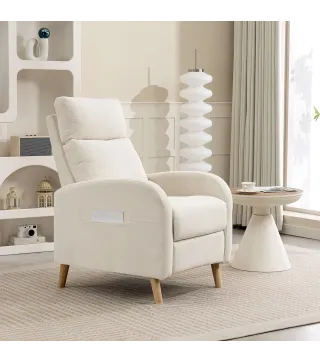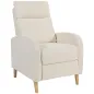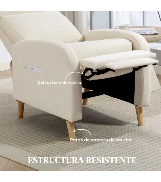 Descubre el valor de la comodidad con este sillón reclinable [BRAND NAME], que se inclina hasta 150° y cuenta con un reposapiés retráctil, facilitando el paso de una posición sentada a tumbada. Su asiento con muelles ensacados, combinado con espuma de alta densidad y tapizado en tejido transpirable con tacto de lino, ofrece un apoyo y confort de gran calidad. Convierte tu descanso en un placer único con este sillón acolchado de [BRAND NAME].Características:- Sillón reclinable hasta 150° con reposapiés retráctil de dos secciones para mayor relax- Empuja el reposapiés hacia atrás con los talones, y el respaldo volverá a su posición original- Sillón acolchado con asiento de muelles ensacados y espuma de alta densidad para una comodidad superior- Sillón de salón tapizado en tejido transpirable con tacto de lino, resistente al desgaste- Reposabrazos curvados que ofrecen un excelente apoyo- Estructura de acero con patas de madera de caucho para mayor estabilidad- Fácil de montar Especificaciones:- Color: crema- Material: lino (100% poliéster), espuma, acero, madera de caucho- Medidas totales: 68x90x106 cm (LxANxAL)(vertical)- Medidas totales: 68x155x83 cm (LxANxAL)(reclinado)- Medidas del asiento: 51x52x52,5 cm (LxANxAL)- Medidas del respaldo: 55x64 cm (ANxL)- Grosor del cojín del respaldo: 35 cm- Altura del reposabrazos: 65 cm- Carga máxima: 135 kg- Referencia: 83B-062V00CWEl paquete incluye:- 1 x Sillón reclinable- 1 x Manual de instrucciones